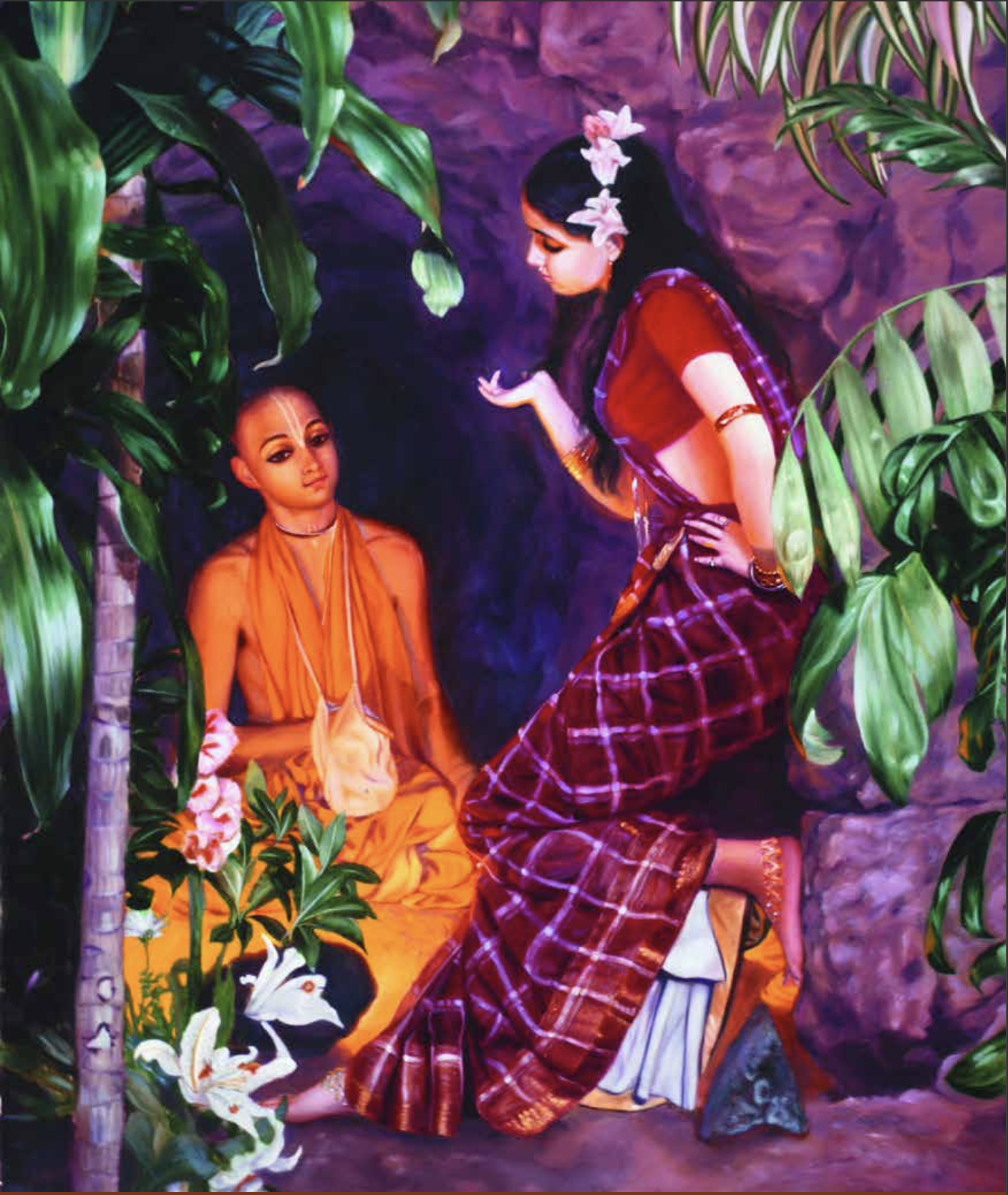 <figure><img src="https://3300249265-files.gitbook.io/~/files/v0/b/gitbook-x-prod.appspot.com/o/spaces%2FAtH5B10zw7W6KQduSGE6%2Fuploads%2FNRiZEFgPaBBWQ2Ukrirv%2FScreenshot%202023-08-16%20at%2013.56.59.png?alt=media&#x26;token=82737e8e-c453-476e-8de8-4758a54455f3" alt=""><figcaption><p>Whilst chanting in his cave, Haridas was tested by Mayadevi but remained focused in his devotional practices.</p></figcaption></figure>